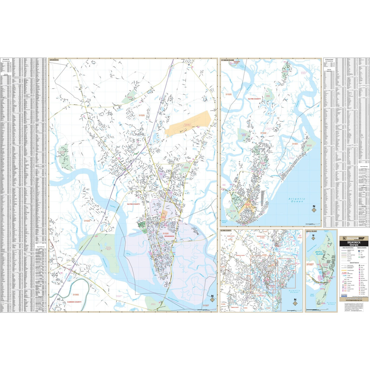 The Brunswick, Georgia Wall Map by Kappa Map Group includes St. Simons Island and Jeckyll Island. It provides comprehensive coverage of the region with up-to-date cartography in complete street detail, at a scale of 1" = 1666". Streets are indexed on the face of the map.