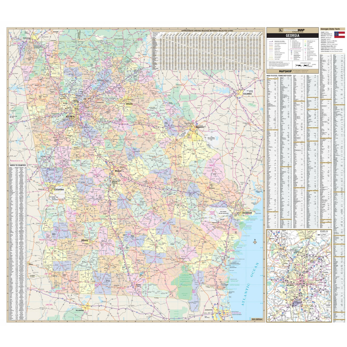 The Georgia State Wall Map from Kappa Map Group is a valuable geographical resource. This map includes color-coded counties and a mileage chart between major cities, along with Georgia State Facts for added context.