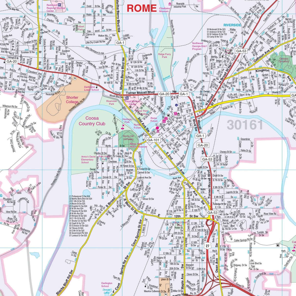 The Rome and Floyd County, GA Wall Map provides comprehensive coverage, encompassing all of Floyd County and extending into Lyerly and Trion in Chattooga County. This detailed map is designed for ease of use and clarity.