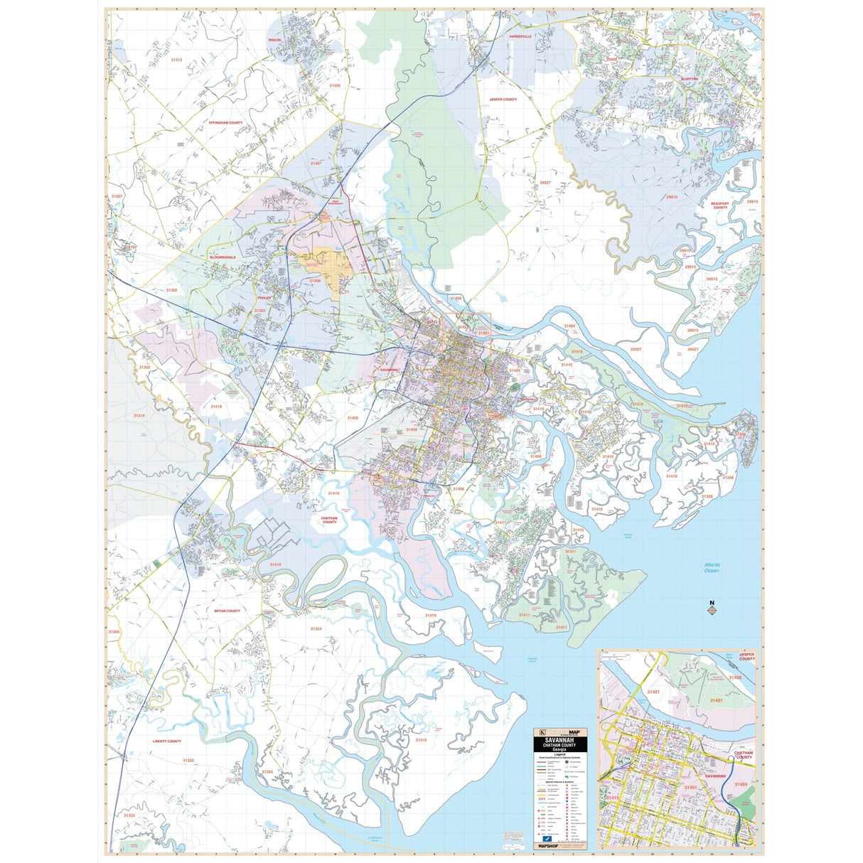 The Savannah & Chatham County, GA Wall Map offers comprehensive coverage of Chatham County, presenting up-to-date cartography that includes newly added streets and recent changes in complete street detail.