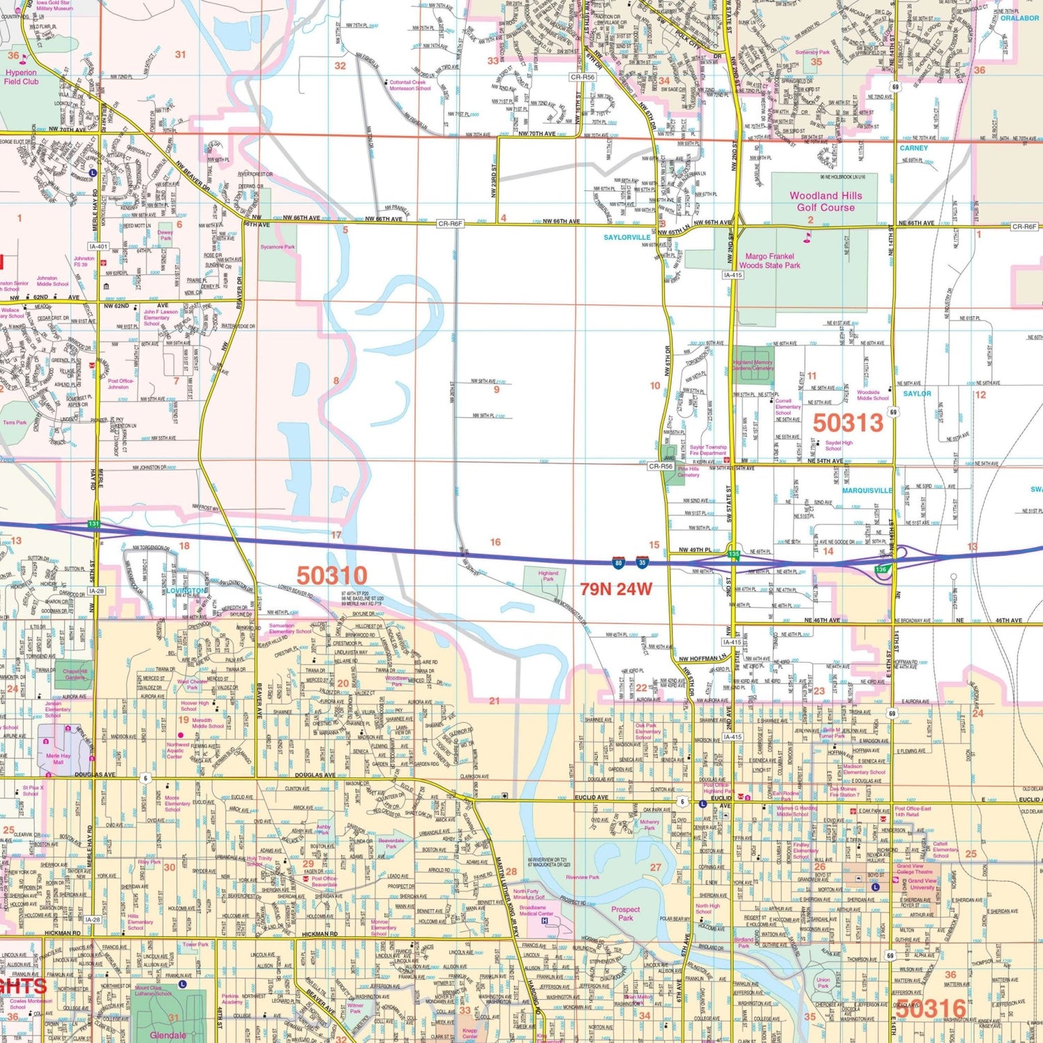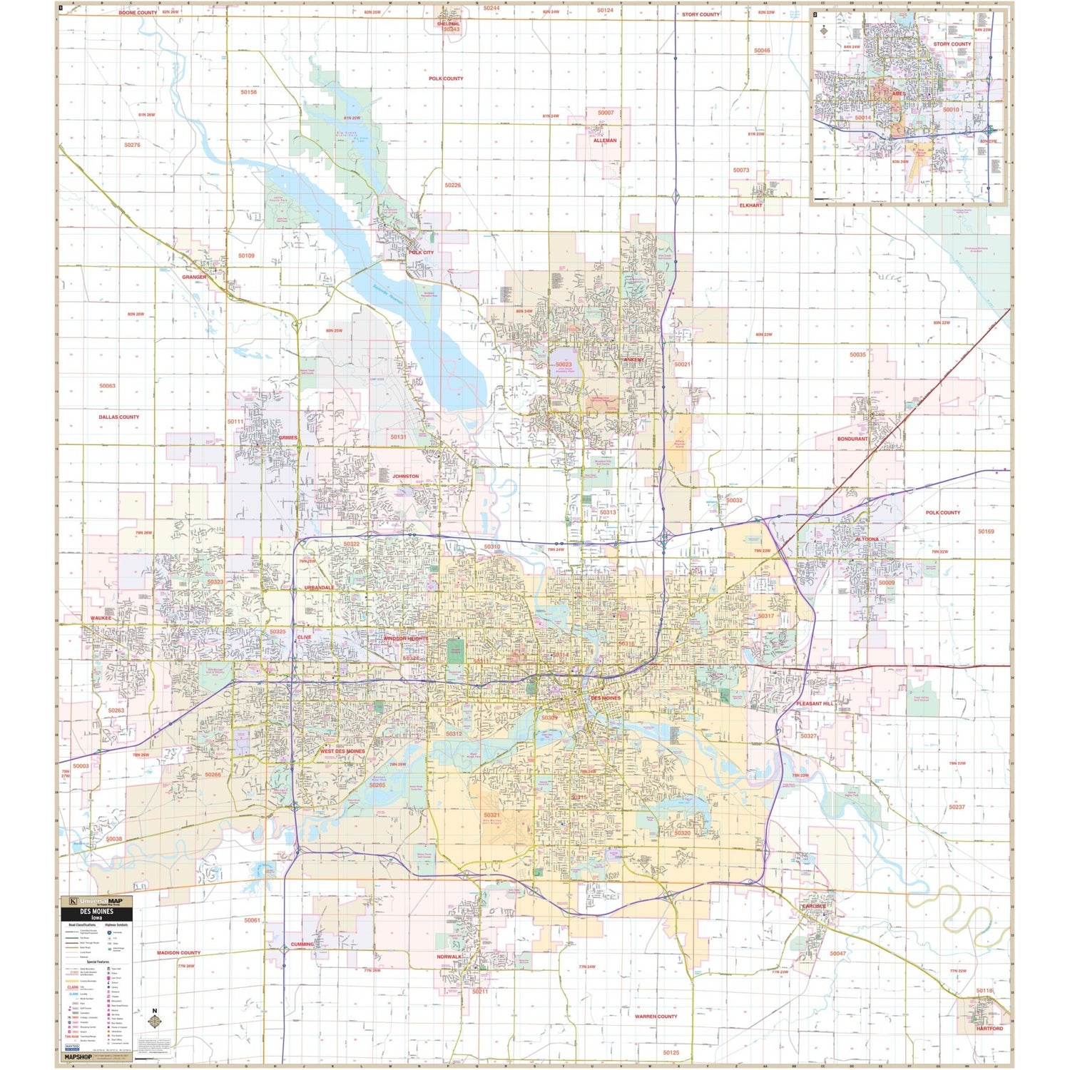 Explore the detailed Des Moines, IA Wall Map and its surrounding areas, providing complete street-level detail for easy navigation. This map covers all of Des Moines and the neighboring communities, offering extensive coverage that includes the following boundaries: