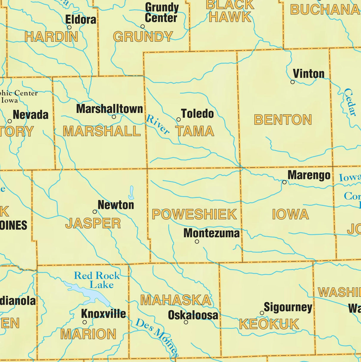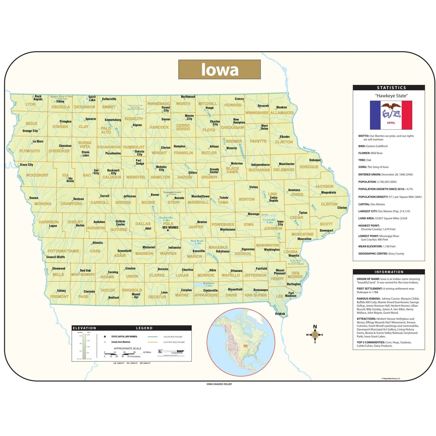The Iowa Shaded Relief Wall Map by Kappa Map Group comes in three sizes. It includes: