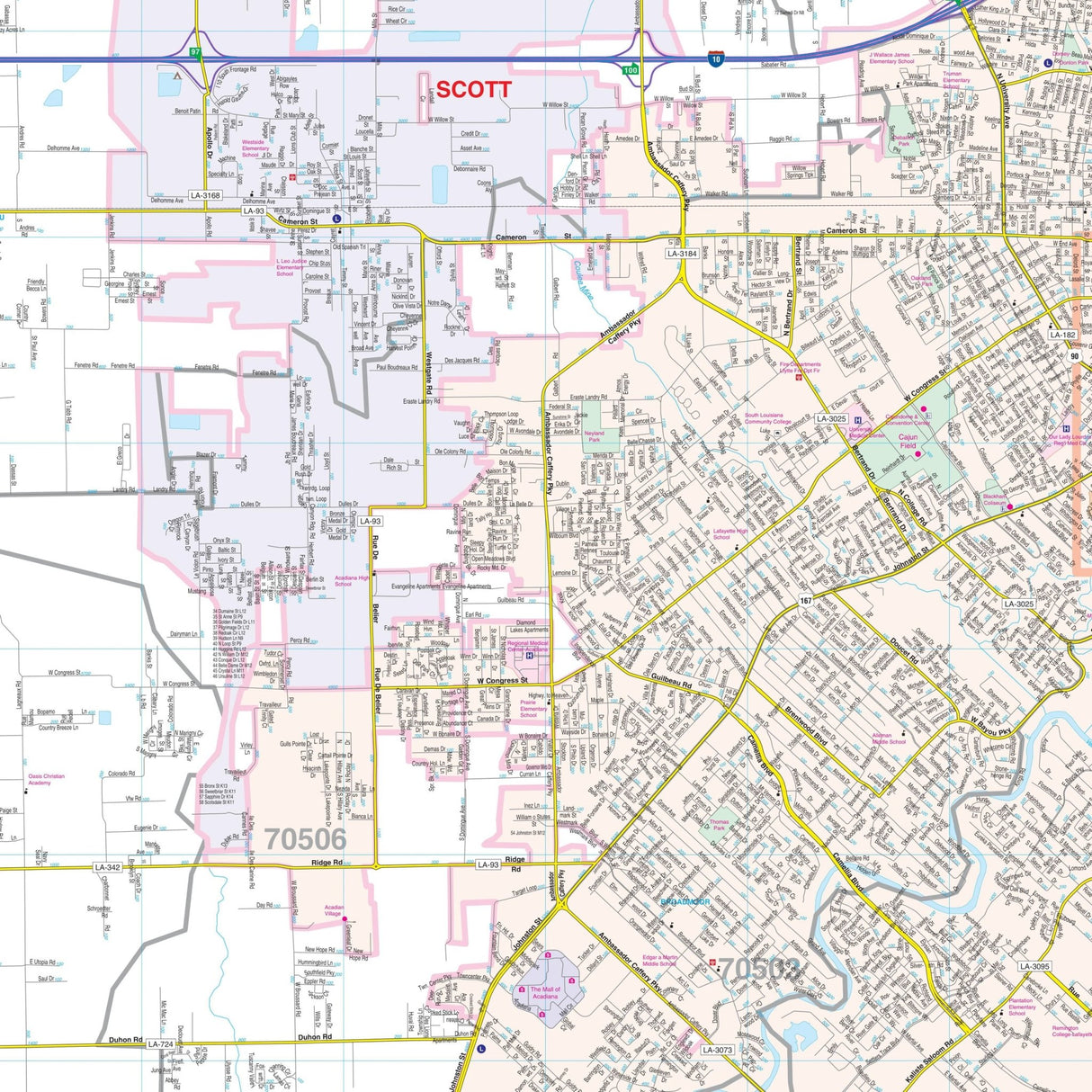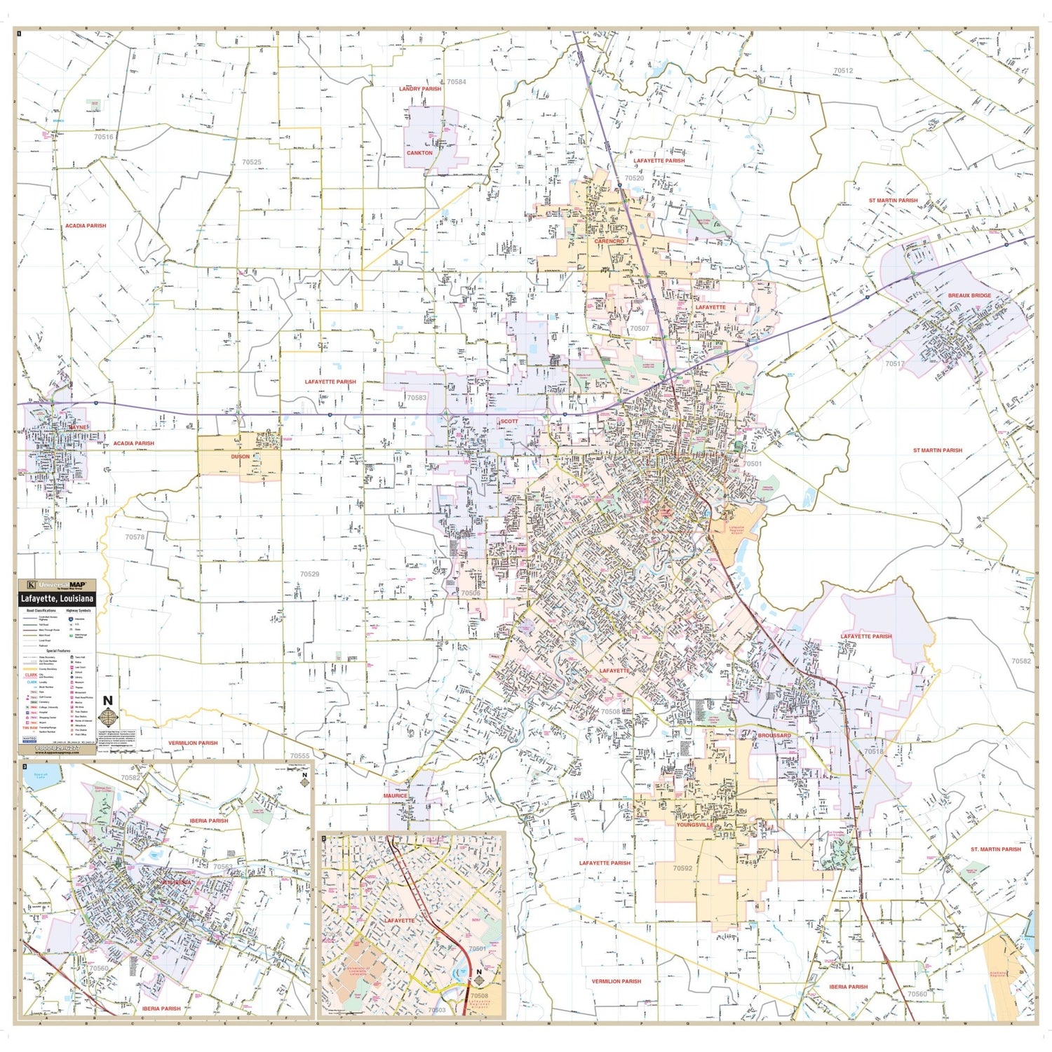 The Lafayette Parish Wall Map features a wealth of essential information, including the locations of airports, cemeteries, city limits (color-coded), educational institutions, fire and police stations, golf and country clubs, government buildings, hospitals, libraries, points of interest, post offices, railroads, recreational parks, shopping centers, streets and highways, as well as water features. Additionally, it outlines ZIP code boundaries, making it a valuable resource for exploring Lafayette Parish.