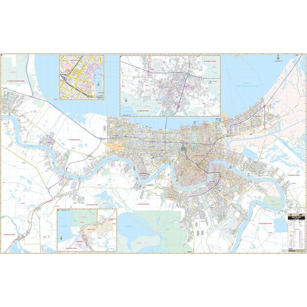 Discover the complete street layout of New Orleans, including areas such as Lake Pontchartrain to the north, Jean Lafitte National Historical Park and the New Orleans US Naval Air Station to the south, the intersection of US Highways 90 & 11 to the east, and the intersection of Interstate 10 and Belle Terre Blvd to the west. The map also features insets for Slidell & Downtown New Orleans.