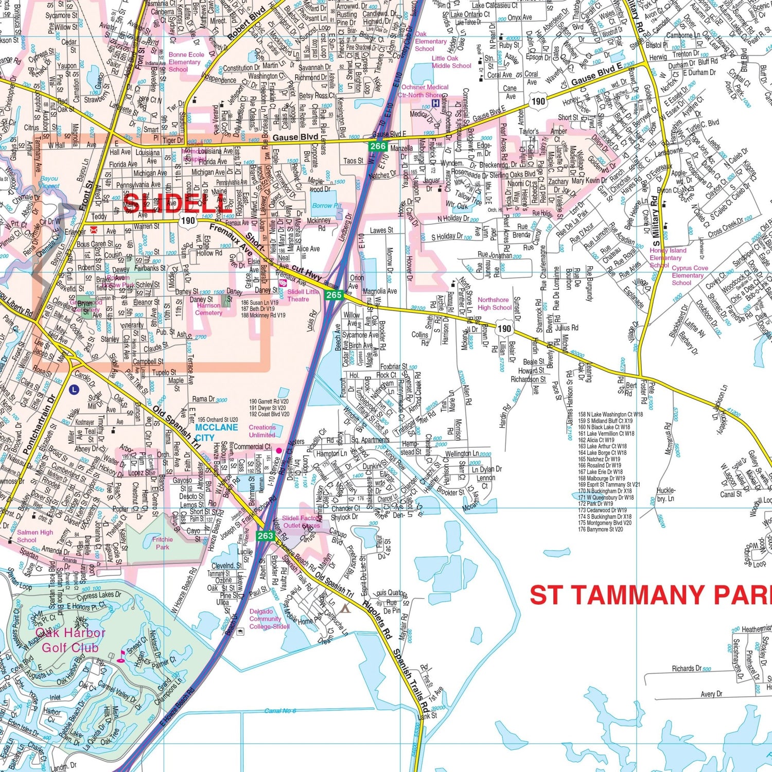 Explore the comprehensive St. Tammany Parish, LA Wall Map, covering the entire parish along with adjacent areas. This map offers complete street detail, extending north to the Washington Parish line, south to Lake Pontchartrain, east to the Mississippi State line, and west to the Tangipahoa Parish line.
