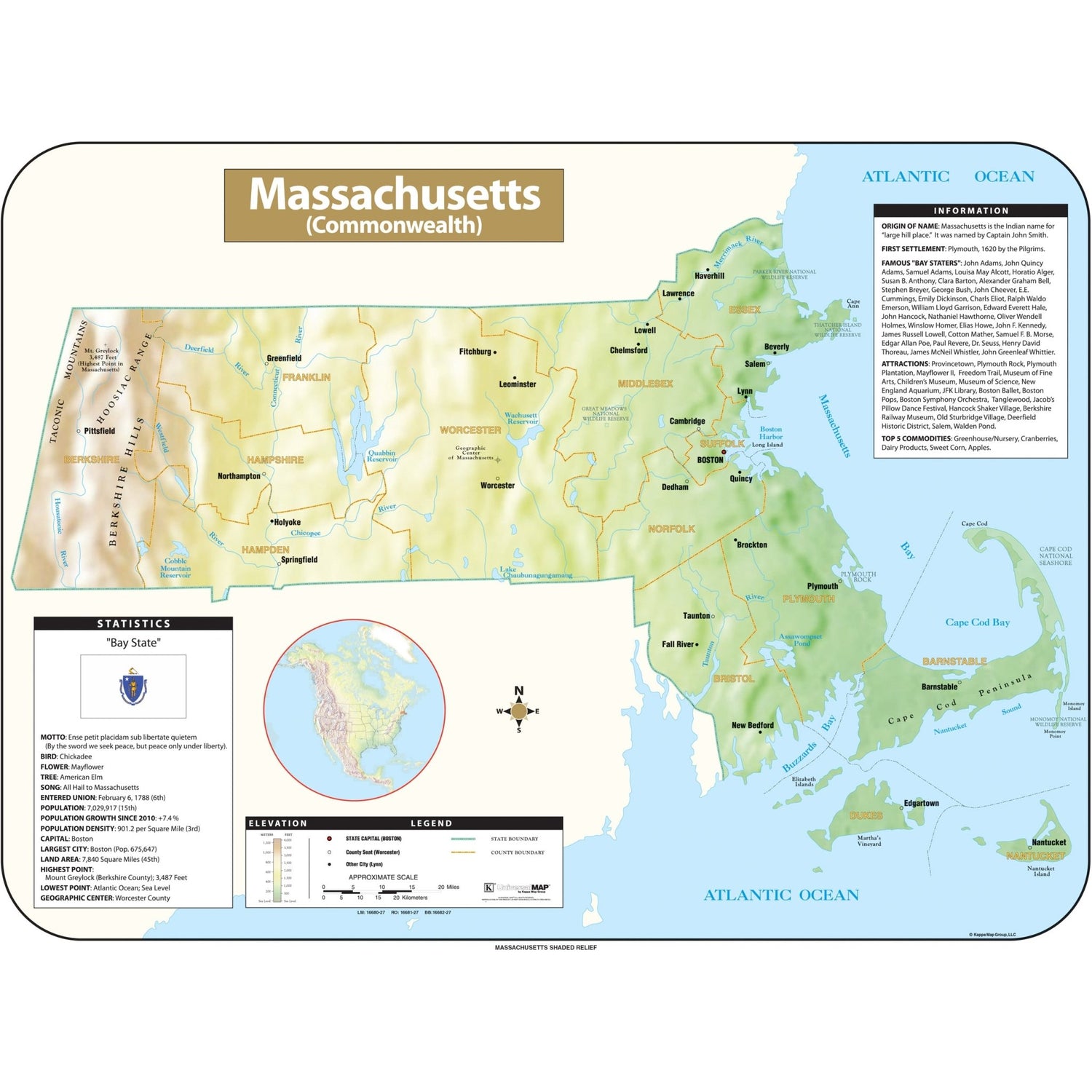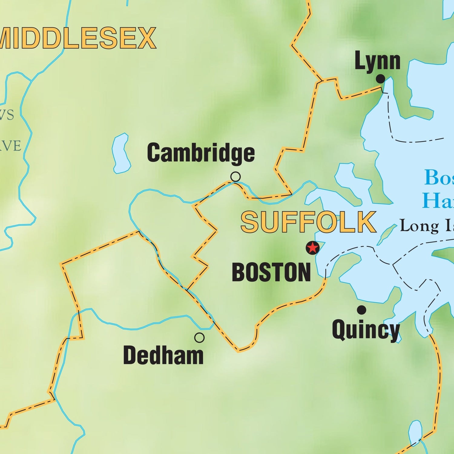 The Massachusetts Shaded Relief Wall Map by Kappa Map Group comes in three sizes. It includes: