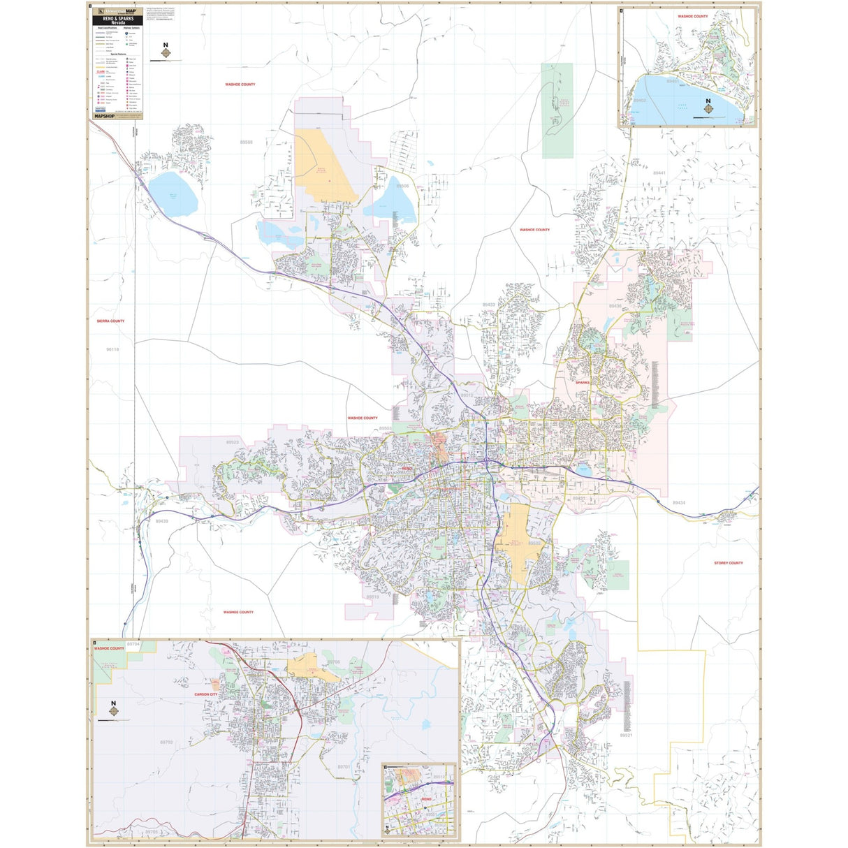 The Reno, NV Wall Map also includes insets of Incline Village, Carson City, and an enlarged Downtown Reno. Details and features on the map include airports, block numbers, cemeteries, city limits, educational institutions, fire & police stations, golf & country clubs, government buildings, hospitals, longitude & latitude coordinates, points of interest, post offices, railroads, recreational parks, shopping centers, streets & highways, water features, and ZIP code boundaries.