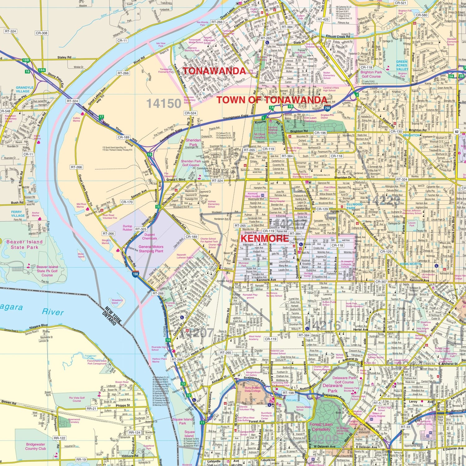 The Buffalo & Erie Co, NY Wall Map, with adjacent areas, provides complete street detail and covers the following boundaries: