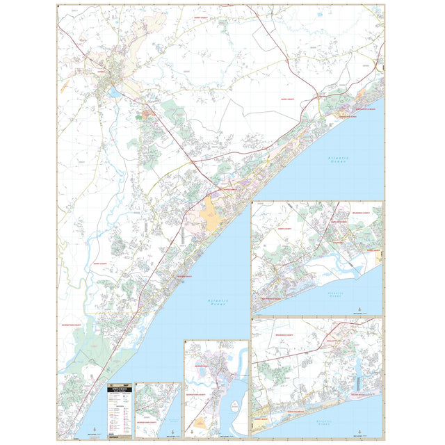 The Myrtle Beach, SC Wall Map also includes insets of Georgetown and continues its coverage of Pawley's Island to Pawley's Plantation Golf & Country Club, North Myrtle Beach, and Holden Beach, NC. Details and features depicted on the map encompass a wide range of information essential for residents and visitors, including airports, block numbers, cemeteries, city limits (color-coded), educational institutions, fire and police stations, golf and country clubs, government buildings, hospitals, libraries, marinas, points of interest, post offices, railroads, recreational parks, shopping centers, streets and highways, water features, and ZIP code boundaries.