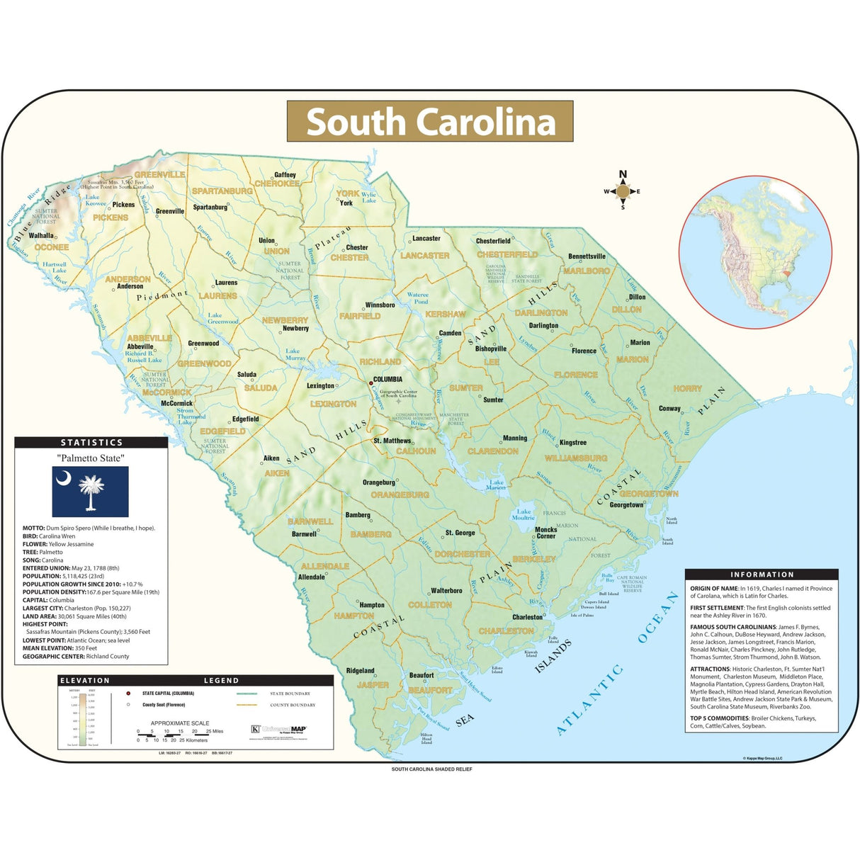 The South Carolina Shaded Relief Wall Map by Kappa Map Group comes in three sizes. It includes: