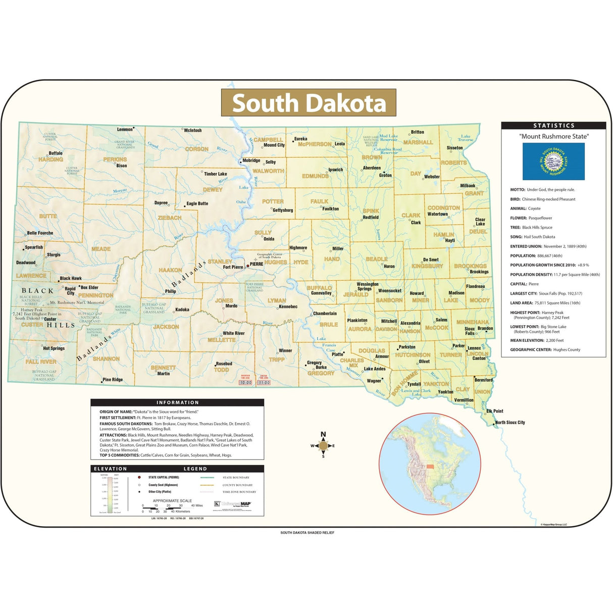 The South Dakota Shaded Relief Wall Map by Kappa Map Group comes in three sizes. It includes: