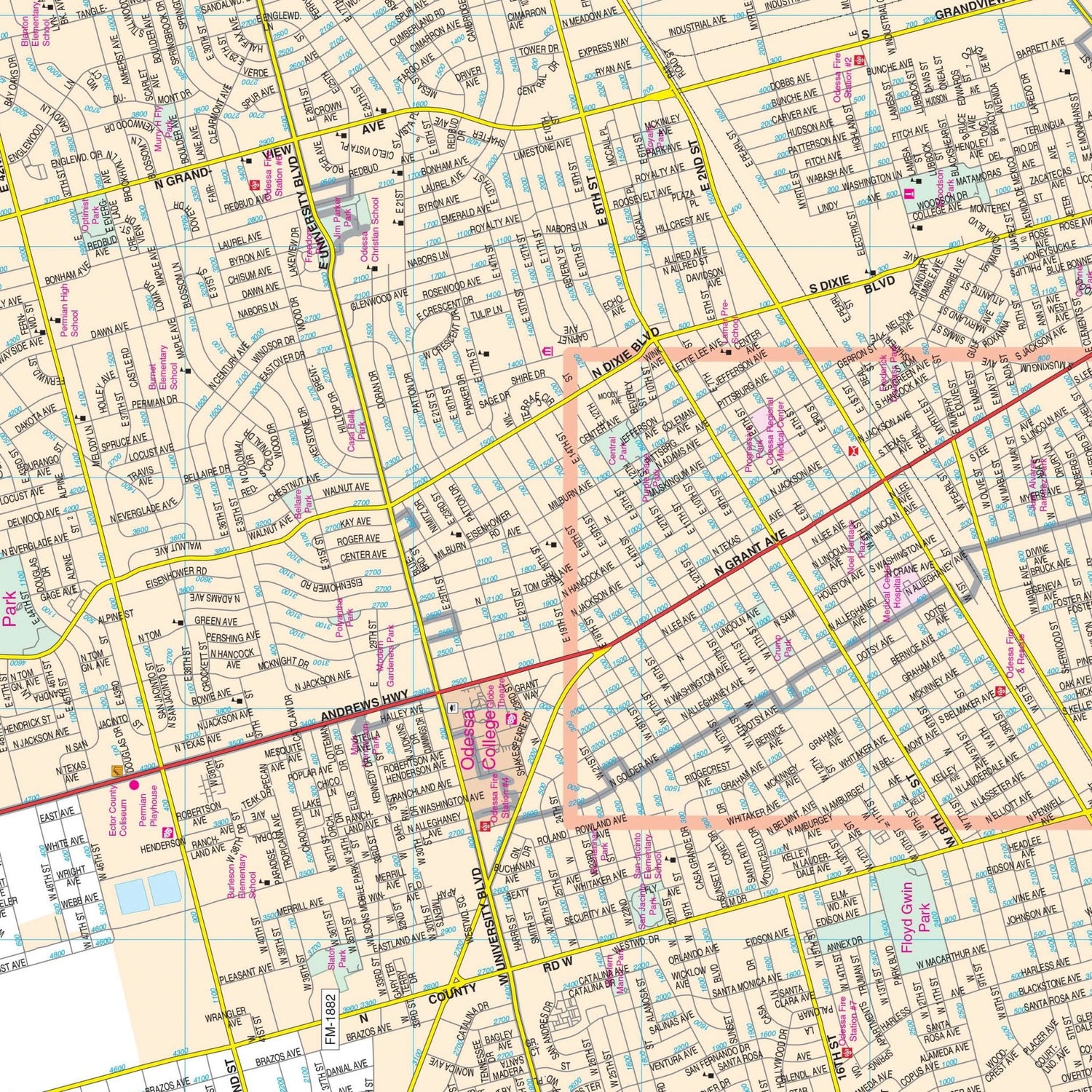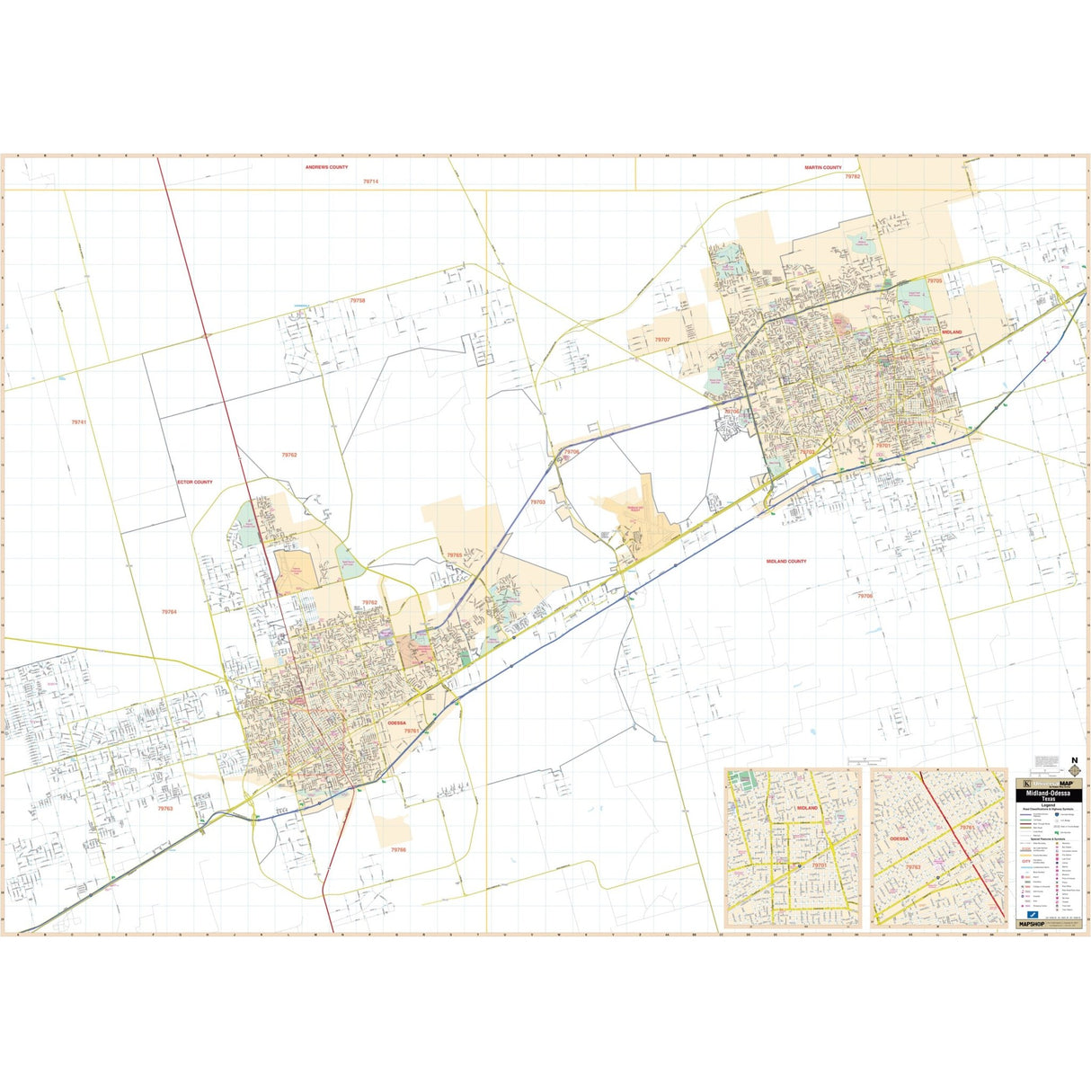 The Midland and Odessa, TX Wall Map, with adjacent areas, offers complete street detail without specific measurements. The area of coverage includes all of Midland and Odessa, with the following boundaries: