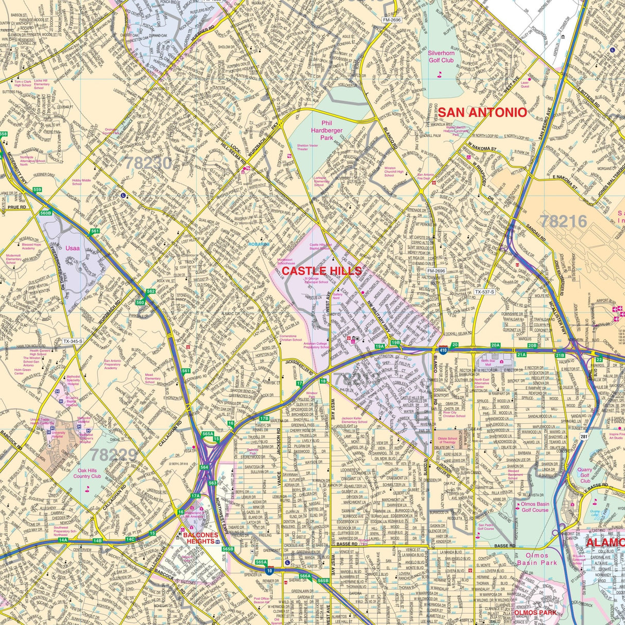 In addition to thoroughfares, the map incorporates natural geographic features such as rivers, lakes, and parks, offering a sense of the natural landscape that interacts with the urban environment. It also marks out significant landmarks and public facilities, providing a useful tool for both newcomers and long-time residents. The inclusion of zoning areas and municipal boundaries serves as a valuable resource for business and government use. Overall, the map combines functionality with a detailed urban layout, presenting a clear picture of San Antonio's metropolitan expanse.