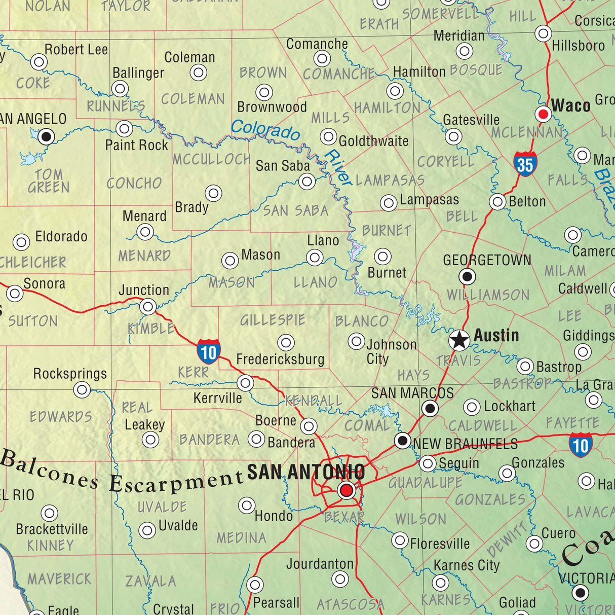 The Texas State Primary Thematic Wall Map is the perfect teaching aid for state studies and related subjects. Political/physical maps with hypsometric colorations; shows county boundaries, interstate highways, county seats, cities and towns, and state regions. Maps correlate with state standards and curriculum guidelines.