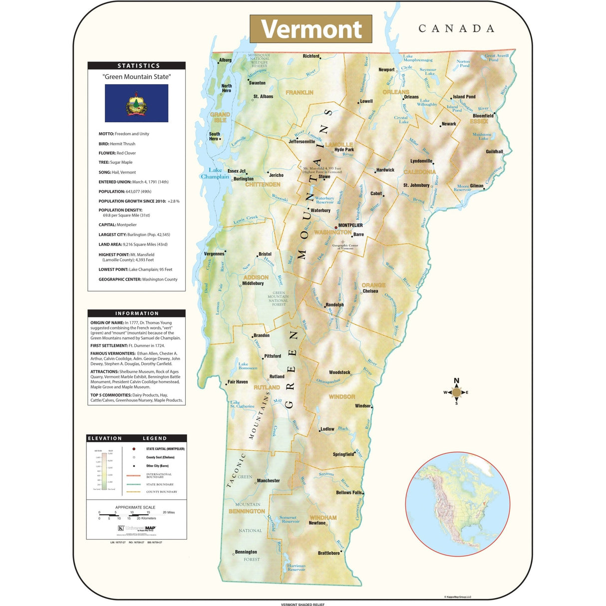 The Vermont Shaded Relief Wall Map by Kappa Map Group comes in three sizes. It includes: