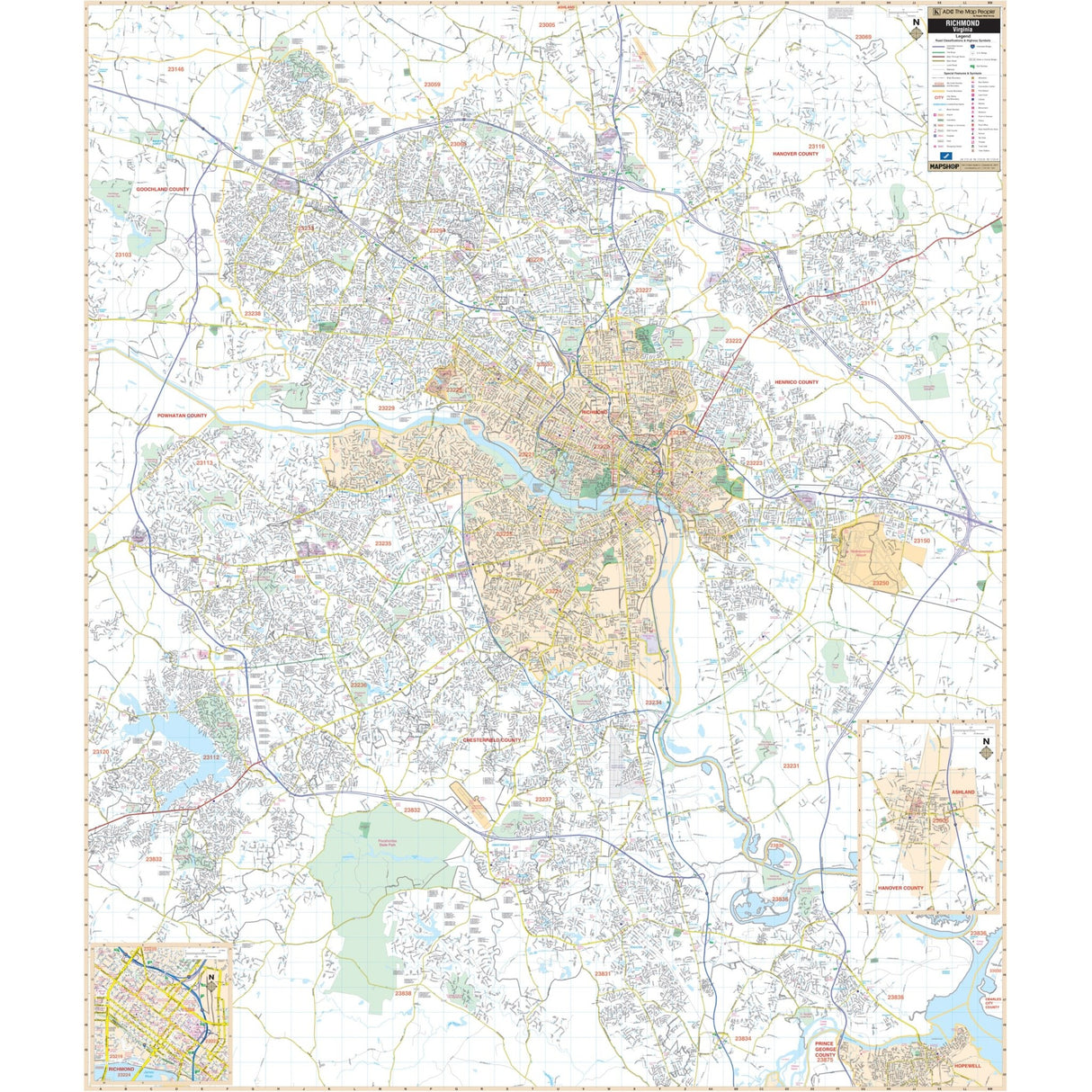 Richmond, VA Wall Map - 54" x 63.5" / Paper is backordered and will ship as soon as it is back in stock.