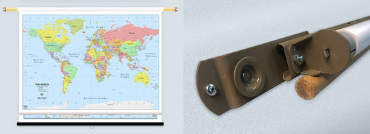 El mapa se lamina y luego se instala sobre un rodillo de resorte. Si no tiene un soporte existente para este tamaño, le sugerimos que solicite la opción de rodillo de resorte y tablero trasero.