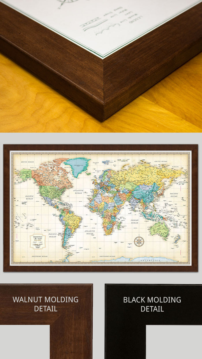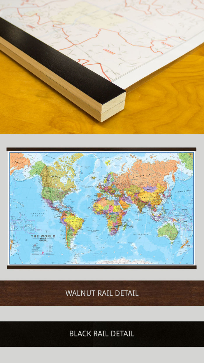 First, we laminate the map then we mount wood rails at the top and bottom of the map. The front side of each rail is finished with a black or walnut finish while the sides and back are unfinished wood.